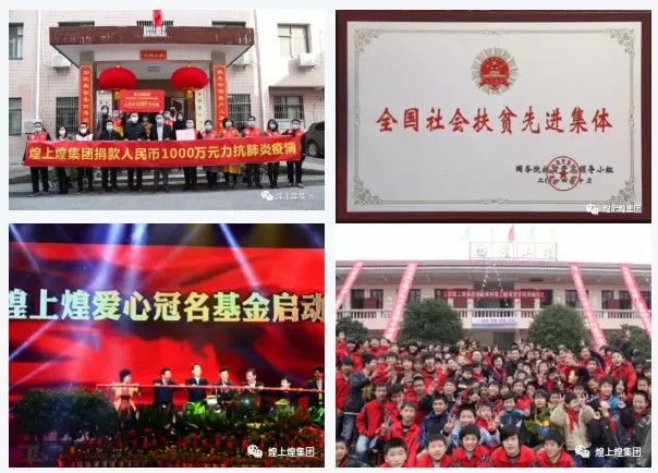 集團(tuán)積極謀求多元經(jīng)營,在全省范圍內(nèi)聯(lián)接培育了27個肉鴨養(yǎng)殖專業(yè)合作社;全資打造“江西茶百年油脂有限公司”,規(guī)劃在全省各地建設(shè)高產(chǎn)優(yōu)質(zhì)油茶基地2萬畝;全資打造江西煌盛房地產(chǎn)開發(fā)有限公司、萍鄉(xiāng)武功山溫泉君瀾度假酒店等多個項(xiàng)目;2016年,集團(tuán)響應(yīng)“一帶一路”國家發(fā)展戰(zhàn)略,成功與新西蘭新溪島公司合作簽訂麥盧卡蜂蜜項(xiàng)目;2017年,集團(tuán)產(chǎn)業(yè)鏈逐步向文化產(chǎn)業(yè)延伸,全面做好煌上煌醬鹵文化館、非物質(zhì)文化博物館、企業(yè)黨群文化館,“三館一體”文化產(chǎn)業(yè)全面起航;近年來,煌上煌成立了集團(tuán)餐飲事業(yè)板塊,目前形成了江西合味原酒店管理有限公司、江西新煌廚餐飲有限公司、江西煌家徐媽鹵汁拌粉品牌運(yùn)營管理公司三大品牌,助推江西贛菜品牌三年行動計劃實(shí)施。煌上煌致富思源,熱心公益慈善事業(yè),積極承擔(dān)社會責(zé)任。累計帶動下崗員工1萬余人就業(yè);在全省捐建6所希望學(xué)校;帶動農(nóng)戶3萬余戶,累計增收3億元;2020年新冠疫情發(fā)生后,第一時間向省紅十字會捐款1000萬元用于抗擊疫情,同時總共分四批次向湖北捐贈產(chǎn)品2萬余份,另有口罩、真真老老產(chǎn)品等醫(yī)用物資,總計折合人民幣200多萬元。數(shù)年來為抗洪抗震救災(zāi)、扶貧修橋修路、資助失學(xué)兒童,興辦希望小學(xué)等,累計捐款捐物達(dá)8000多萬元,被國務(wù)院扶貧開發(fā)領(lǐng)導(dǎo)小組評為“全國社會扶貧先進(jìn)集體”。并于2013年成立了煌上煌愛心基金會,標(biāo)志著煌上煌向愛心事業(yè)代代相傳進(jìn)行到底。