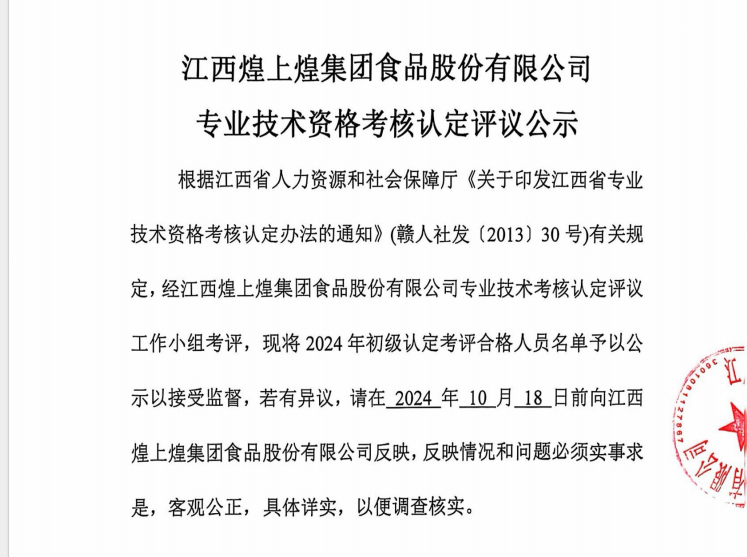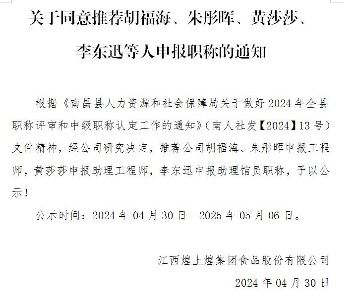 根據(jù)《南昌縣人力資源和社會(huì)保障局關(guān)于做好2024年全縣職稱評(píng)審和中級(jí)職稱認(rèn)定工作的通知》(南人社發(fā)【2024】13號(hào))文件精神,經(jīng)公司研究決...