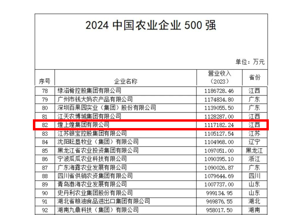12月11日,農(nóng)民日?qǐng)?bào)社發(fā)布2024中國(guó)農(nóng)業(yè)企業(yè)500強(qiáng)榜單。榜單聚集發(fā)布糧油、畜牧、奶業(yè)、水產(chǎn)、食品、流通、農(nóng)資等領(lǐng)域頭部企業(yè),煌上煌集團(tuán)...