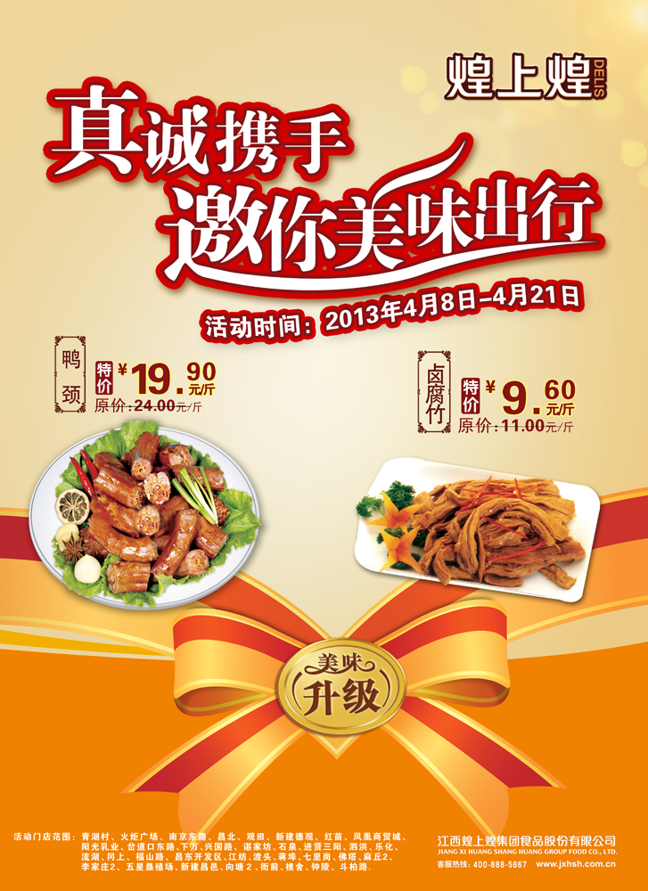 活動(dòng)內(nèi)容:鴨脖特價(jià)19.9元/斤(原價(jià)24元/斤),鹵腐竹特價(jià)9.6元/斤(原價(jià)11元/斤)