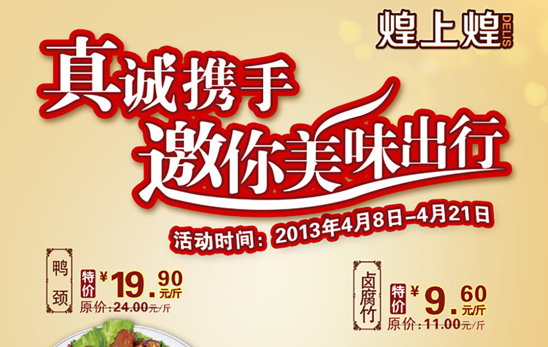 活動(dòng)時(shí)間:2013年4月8日-4月21日活動(dòng)內(nèi)容:鴨脖特價(jià)19.9元/斤(原價(jià)24元/斤),鹵腐竹特價(jià)9.6元/...