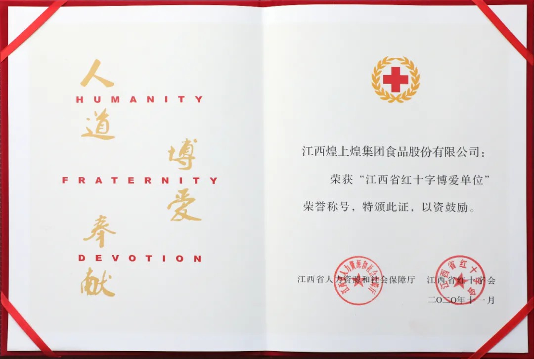大會(huì)表彰了“江西省紅十字博愛大使”“江西省紅十字博愛單位”,其中,江西煌上煌集團(tuán)食品股份有限公司榮獲“江西紅十字博愛單位”榮譽(yù)稱號。
