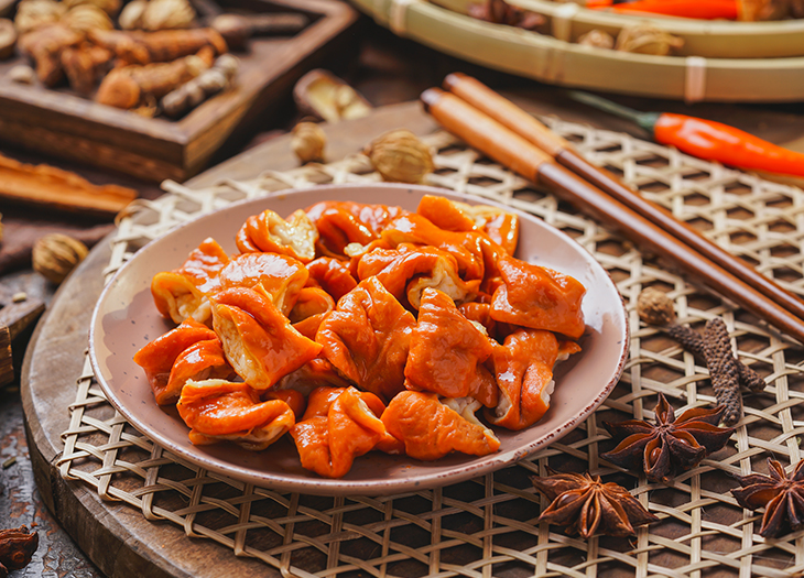 精選牛肚去除筋膜,預煮烹調去腥膻氣味。采用20多種中藥和香辛料濃...香鹵腐竹