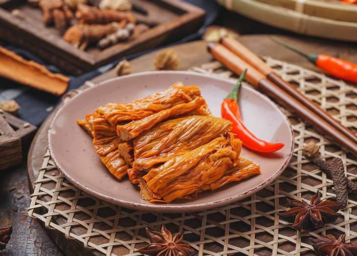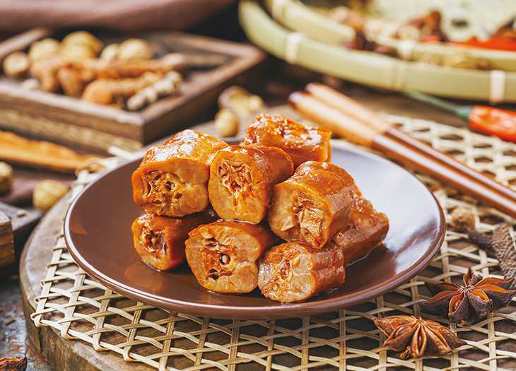 精選高安產特級腐竹,經浸泡、濃湯鹵制而成。產品色澤金黃,包含鹵...香鹵大腸