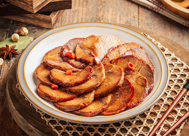 精選規(guī)格一致的新鮮鴨脖,摘凈淋巴組織,采用多種調味料腌漬,經真...香鹵牛肉