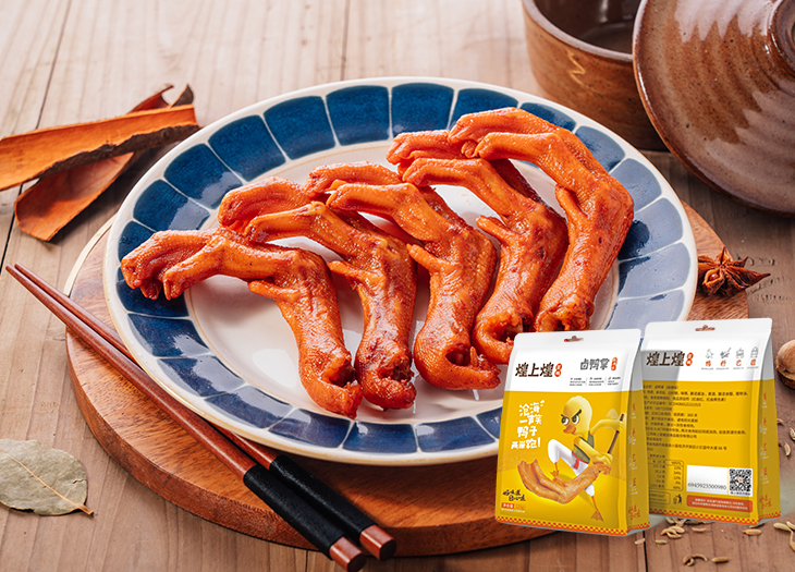 產(chǎn)品介紹:精選體型粗壯的新鮮鴨腳,去凈角質(zhì)皮,蹼皮厚實(shí)。采用20多種中藥、香辛料鹵制而成。產(chǎn)品色澤金黃誘人,香氣飽滿,蹼皮厚實(shí),富有嚼勁。鮮香風(fēng)味物質(zhì)滲透在趾骨之中,越啃越有味。產(chǎn)品分清香、微辣、重辣三種,適合不同嗜辣消費(fèi)群體。香鹵鴨腳是煌上煌的重點(diǎn)暢銷的產(chǎn)品之一,是公司的招牌產(chǎn)品,也稱為招牌鴨掌。